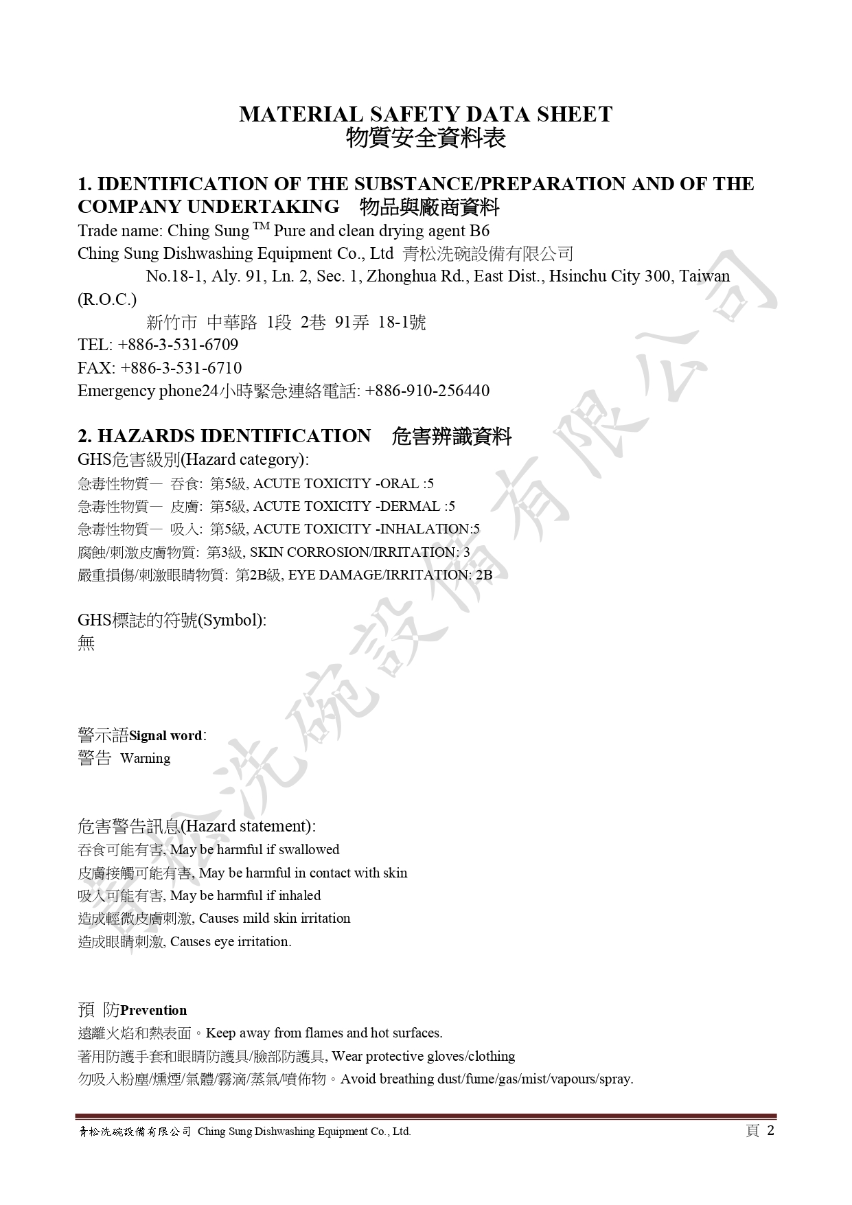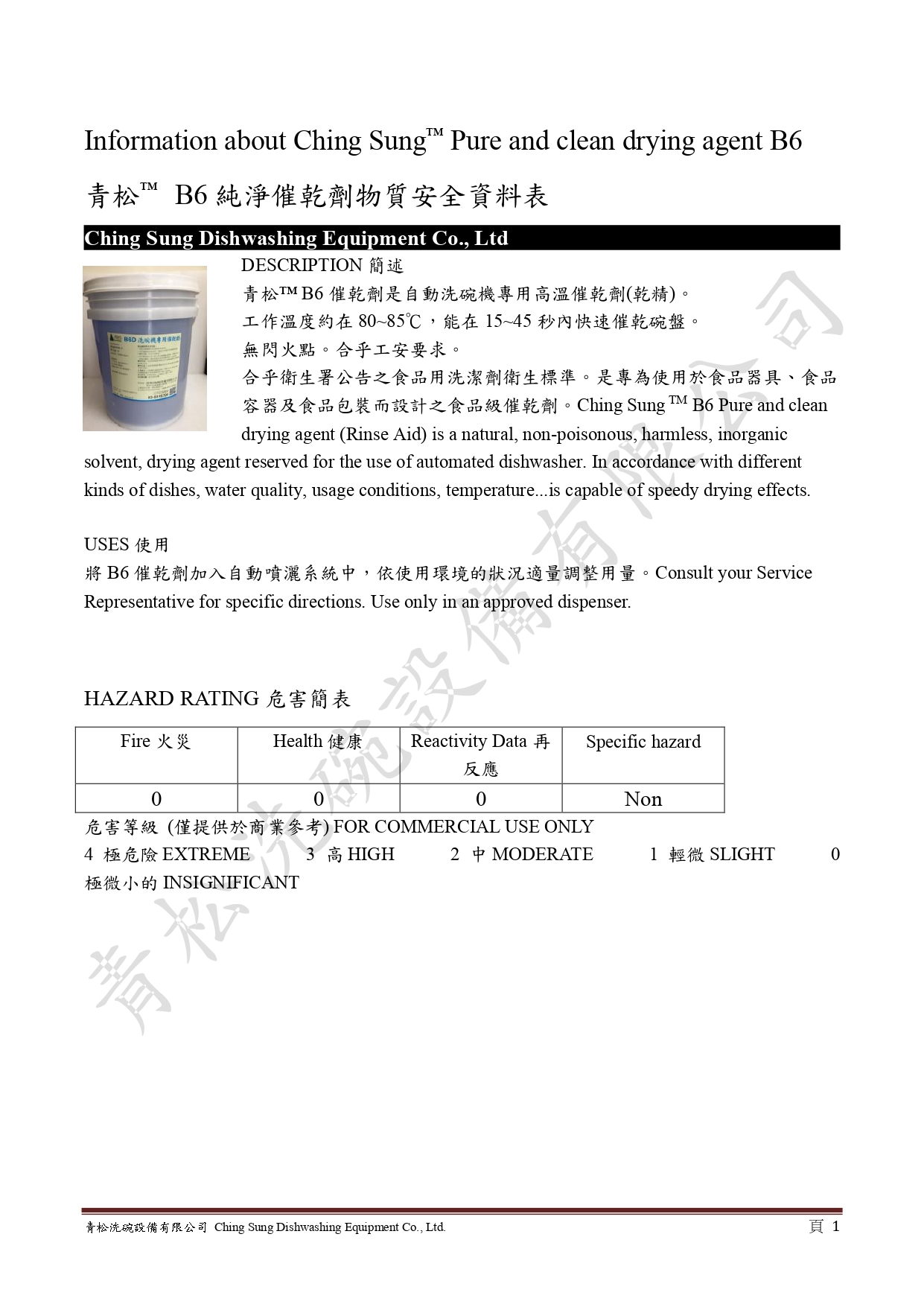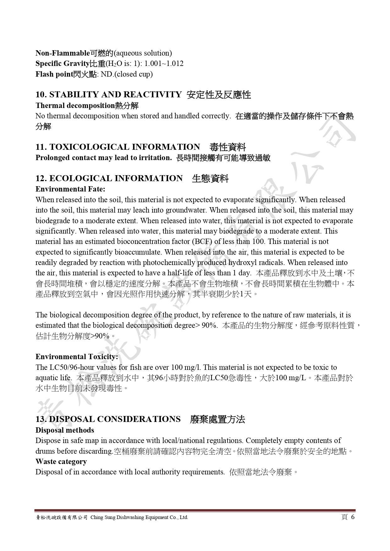 合乎衛生署公告之食品用洗潔劑衛生標準。是專為使用於食品器具、食品容器及食品包裝而設計之食品級催乾劑。