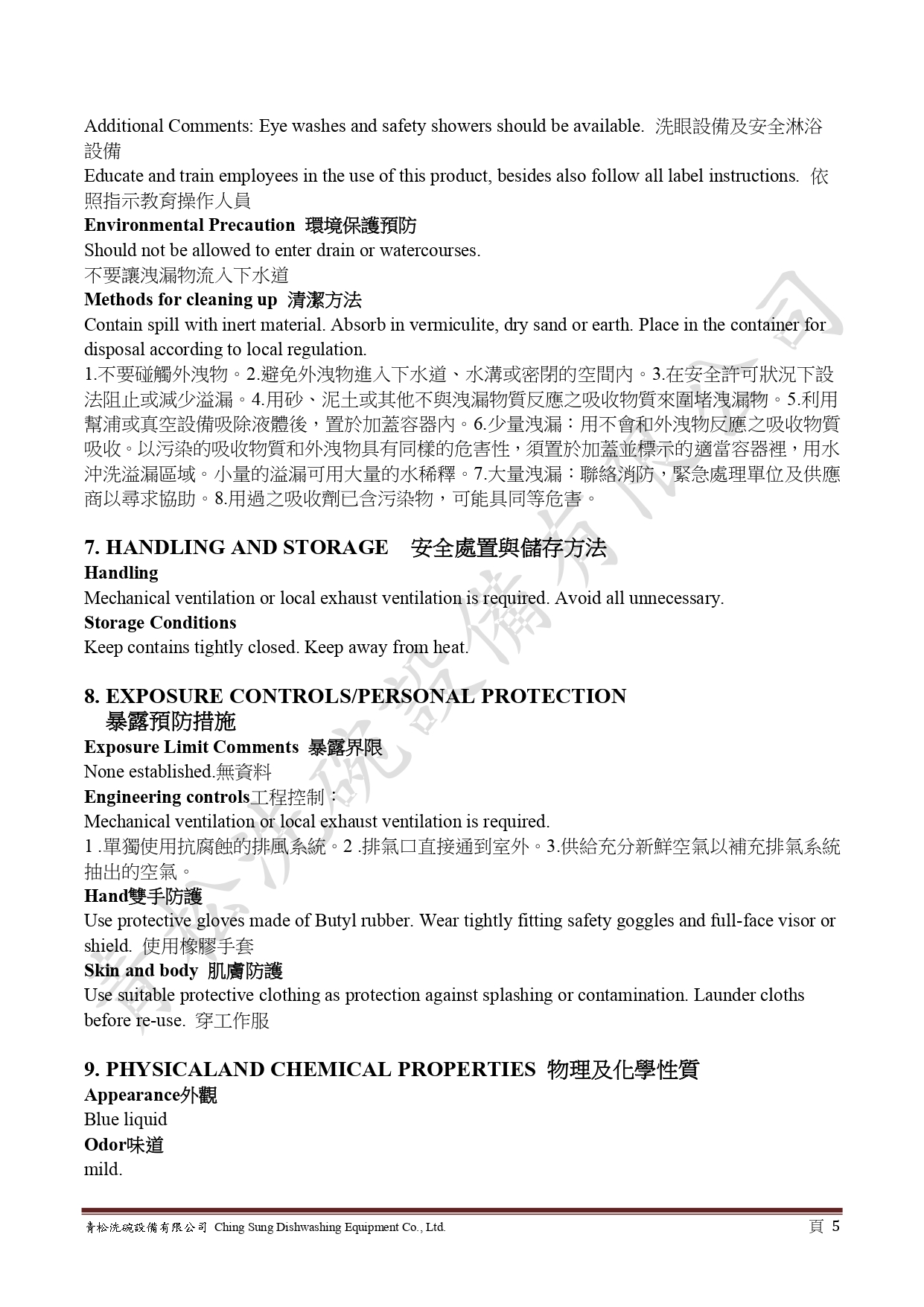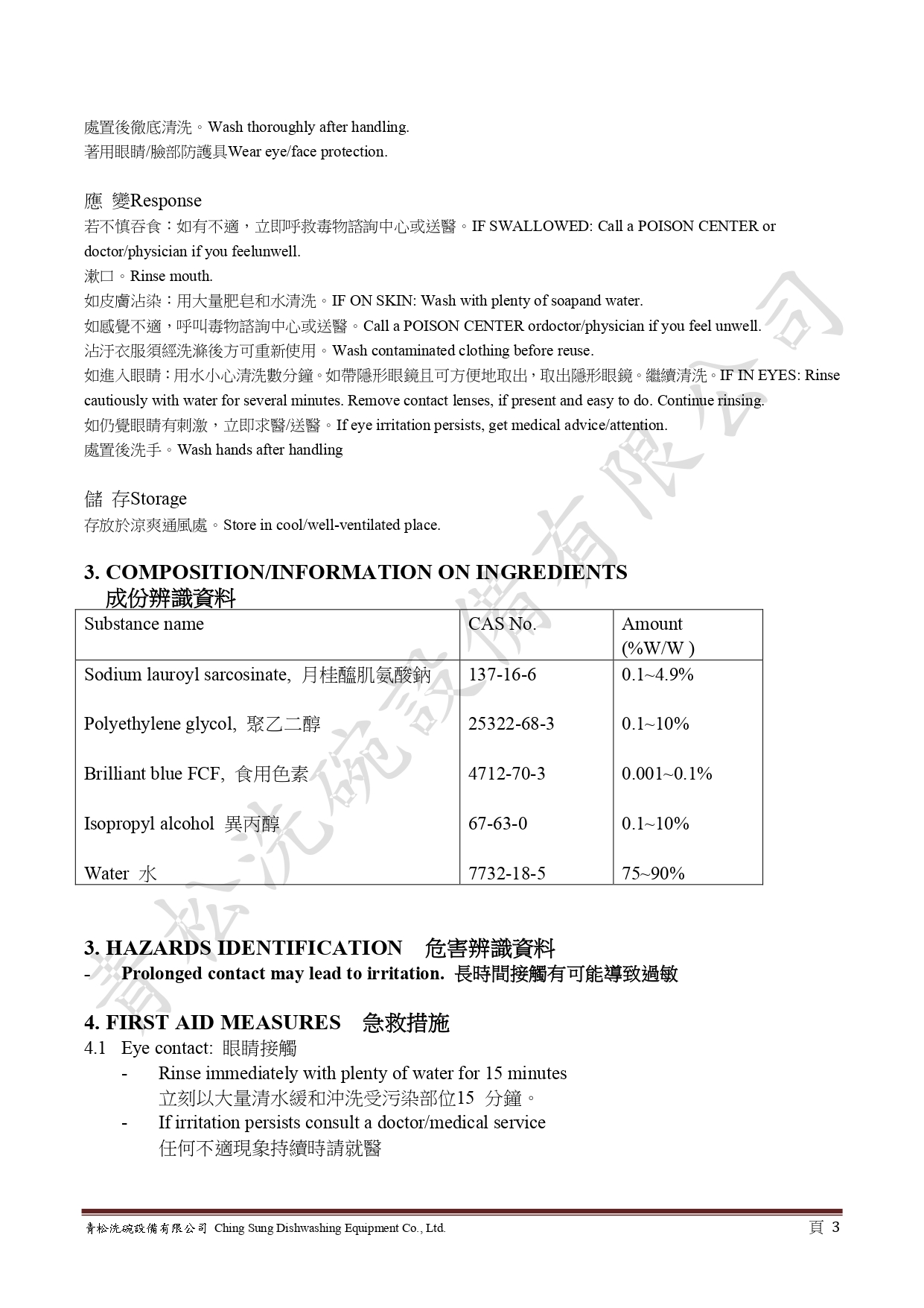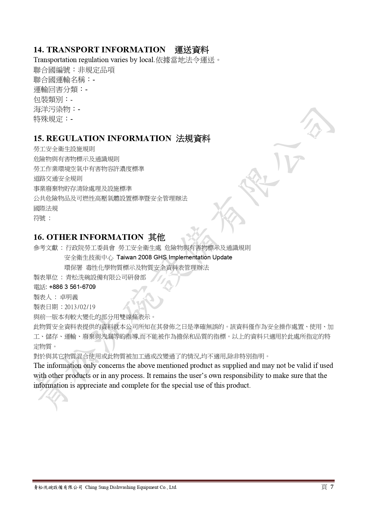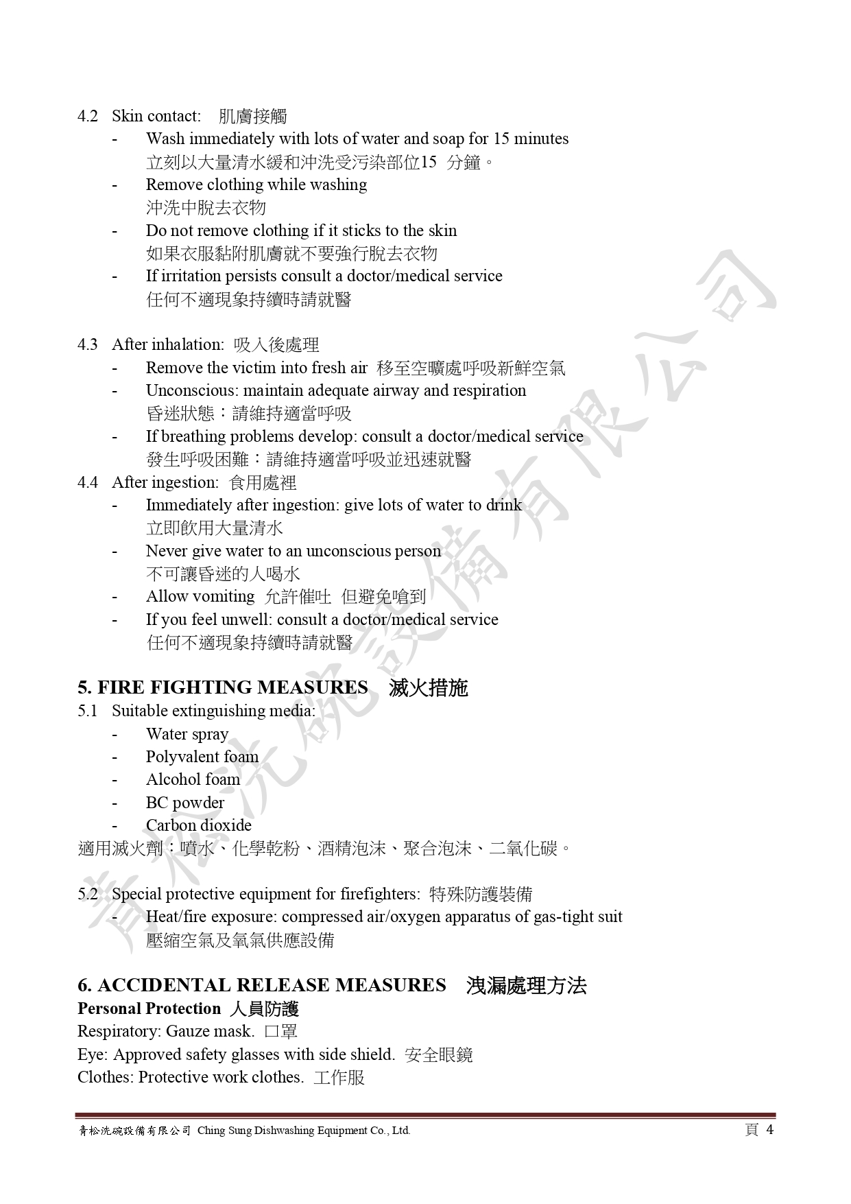 合乎衛生署公告之食品用洗潔劑衛生標準。是專為使用於食品器具、食品容器及食品包裝而設計之食品級催乾劑。